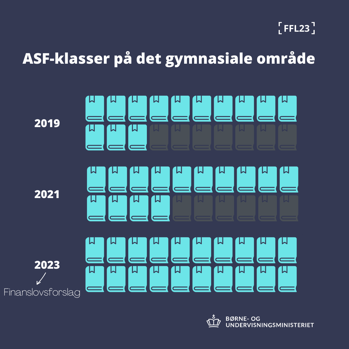 Der er i regeringens finanslovsforslag afsat yderligere 5,3 millioner kroner i 2023 til ASF-klasser, 11,3 millioner kroner i 2024, 13,7 millioner kroner i 2025 og 14,8 millioner kroner fra 2026, svarende til tre stx- og tre hf-klasser.