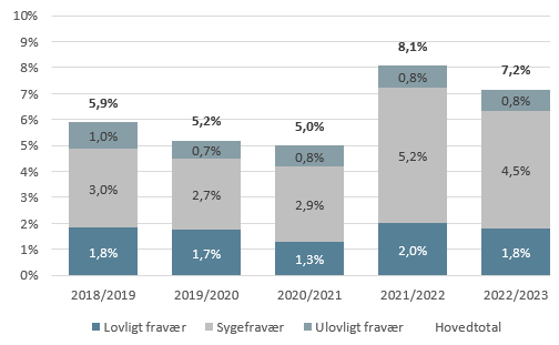 Det samlede fravær ligger stadig på et lidt højere niveau end før covid-19-nedlukningerne. Fra 2010/2011 til 2021/2022 lå det gennemsnitlige fravær stabilt på 5-6 procent Under perioden med covid-19 - og særligt i skoleåret 2021/2022 – var der et højt sygefravær. Det medførte en markant stigning i det samlede fravær.