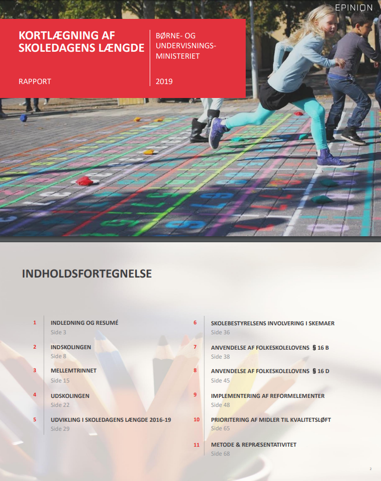 For at følge folkeskolereformens realisering, herunder den længere skoledag, har Børne- og Undervisningsministeriet for femte år i træk bedt Epinion om at foretage en kortlægning blandt alle landets folkeskoler af længden af skoledagen i 1.-9. klasse.