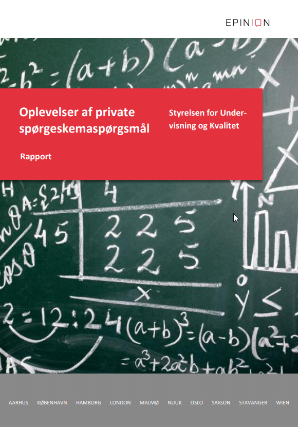 Undervisningsministeriet har fået undersøgt, hvordan elever og forældre forholder sig til ministeriets spørgeskemaundersøgelser. Formålet med undersøgelsen er at få viden om og indsigt i, hvordan elever og forældre oplever spørgsmålene i ministeriets undersøgelser. Læs rapporten Oplevelser af private spørgeskemaspørgsmål (pdf)