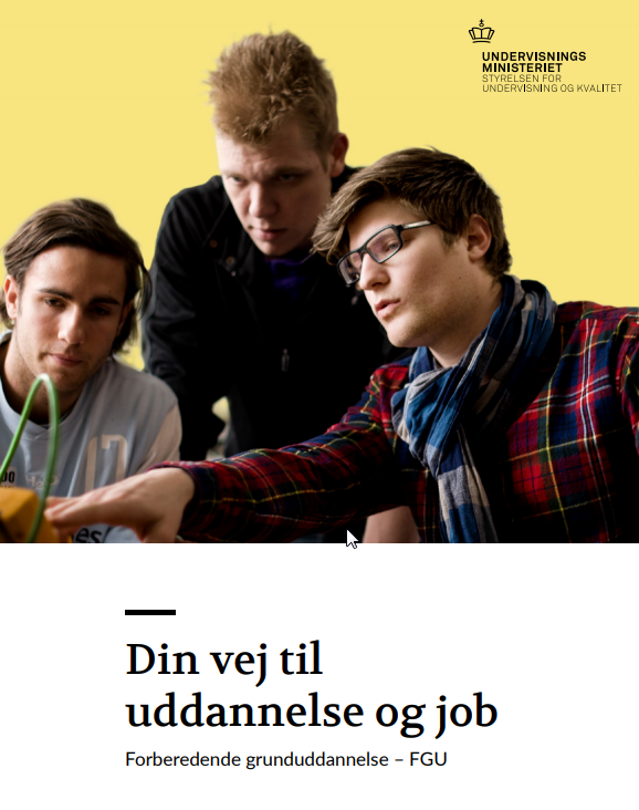 Pjecen er målrettet unge, der overvejer FGU, og deres forældre. I pjecen er der svar på, hvad FGU er, hvad der er særligt ved FGU, hvad man som elev kan bruge en FGU til, og hvordan man kommer ind. Der er også eksempler på tre unges vej til FGU. Pjecen ”Din vej til uddannelse og job - forberedende grunduddannelse” (pdf)