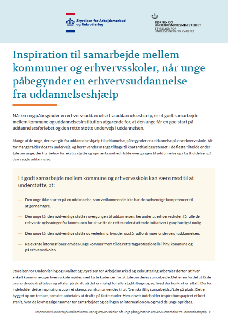 Styrelsen for Undervisning og Kvalitet (STUK) og Styrelsen for Arbejdsmarked og Rekruttering (STAR) har udarbejdet et inspirationspapir til kommuner og erhvervsskoler med vejledning og anbefalinger til gode samarbejder om unge, der påbegynder en erhvervsuddannelse fra uddannelseshjælp.