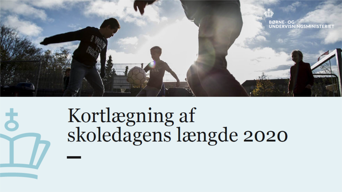 Ved folkeskolereformens implementering var det som udgangspunkt ikke intentionen, at skoledagene skulle vare længere end til kl. 14.00 i indskolingen, 14.30 for mellemtrinnet og 15.00 i udskolingen. Med denne undersøgelse kortlægges udbredelse af og årsagerne til, at skoledagene er længere på nogle af landets skoler. Kortlægningen omfatter alene den almindelige skemalagte undervisning i uge 43 i skoleåret 2020/21.
