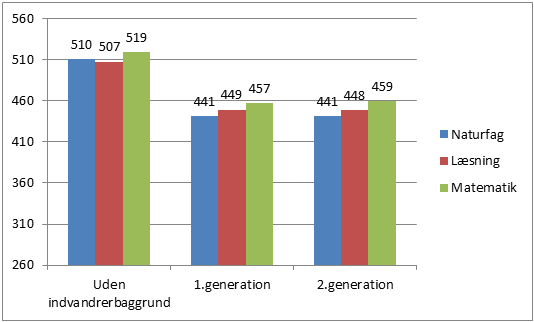 Både i naturfag, læsning og matematik klarer elever med indvandrerbaggrund sig væsentligt dårligere end etnisk danske elever. PISA Etnisk 2015 viser, at elever uden indvandrerbaggrund i gennemsnit scorer 510 point i naturfag, mens både 1.- og 2. generationsindvandrerelever scorer 441 point. Også i læsning og matematik scorer elever uden indvandrerbaggrund væsentligt højere end indvandrerelever.