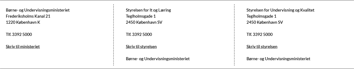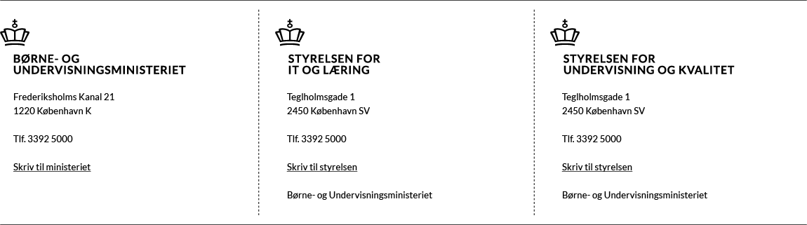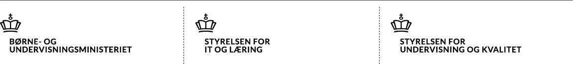Header 1 indeholder logo i form af krone og juridisk navn skrevet nedenunder (henholdsvis Børne- og Undervisningsministeriet, Styrelsen for It og Læring og Styrelsen for Undervisning og Kvalitet). Logo er placeret i venstre side af headeren.