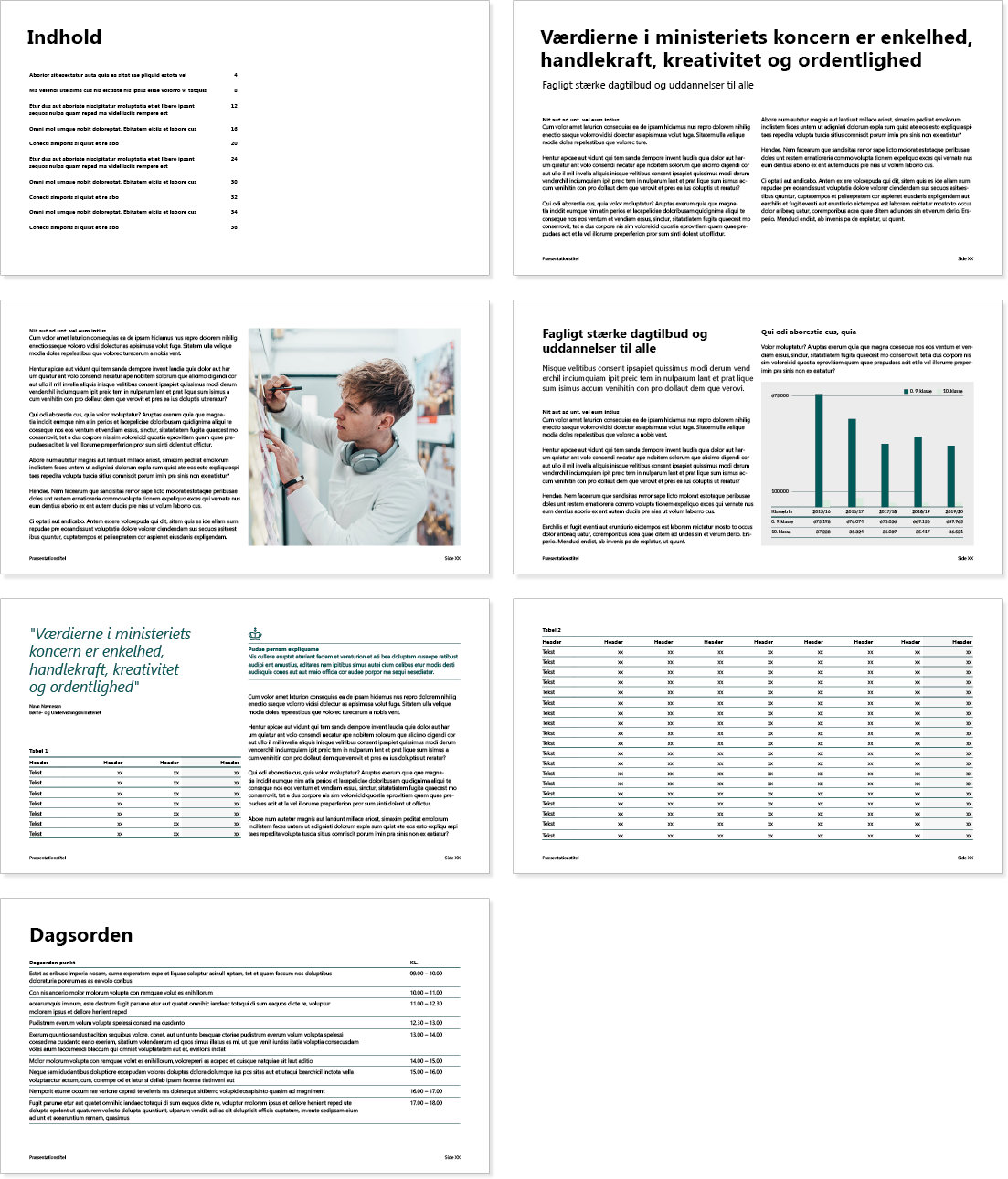 På denne side kan du se eksempler på, hvordan rapport og publikationsskabelonen, PowerPoint-skabelonen samt brevskabelonen ser ud.