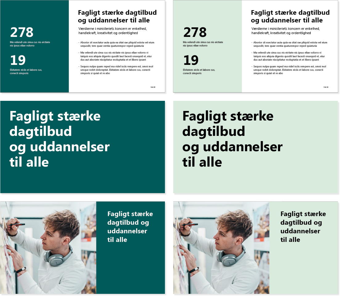 Ministeriets design er overført på alle ministeriets Word-skabeloner i Templafy. Det betyder, at skabelonerne i Word, PowerPoint samt tabeller og grafer er sat op med ministeriets farver, skrifttype, logo m.m., så du kan fokusere på indholdet.