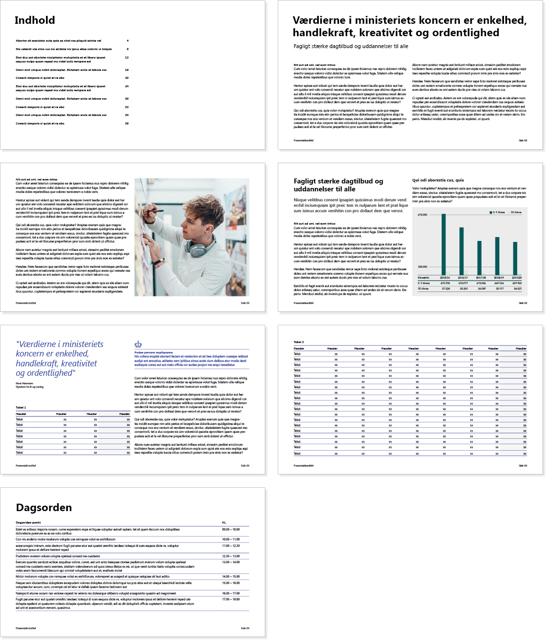 På denne side kan du se eksempler på, hvordan rapport og publikationsskabelonen, PowerPoint-skabelonen samt brevskabelonen ser ud.