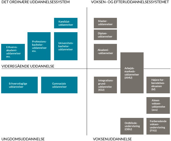 Klik på oversigten over uddannelsessystemet for voksen- og efteruddannelse og læs mere om de forskellige uddannelser.