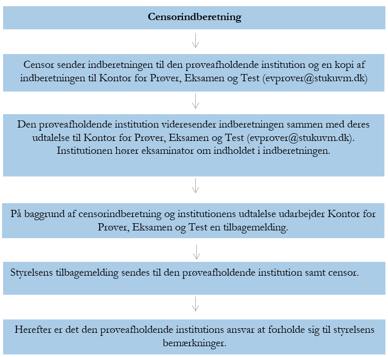Efter institutionen har modtaget censorindberetningen skal institutionen videresende indberetningen til STUK vedlagt en udtalelse. Censorindberetningen og udtalelse skal sendes til følgende mail: eudpet@stukuvm.dk.