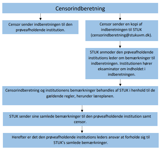 Jf. § 29, stk. 5 i almen eksamensbekendtgørelse, skal institutionen sende sine bemærkninger til censorindberetningen til styrelsen. I mange tilfælde henvender styrelsen sig til prøveafholdende institutions leder og anmoder om bemærkninger, når styrelsen modtager censorindberetningen fra censor, jf. ovenstående procesbeskrivelse.