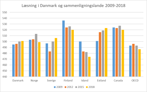 I de øvrige nordiske lande har Finland, Island og Norge oplevet et fald i læseresultater. Læseresultaterne i 2018 er for Sverige, Norge og Danmark på samme niveau. Finland har et højere gennemsnit. Island har et lavere gennemsnit.