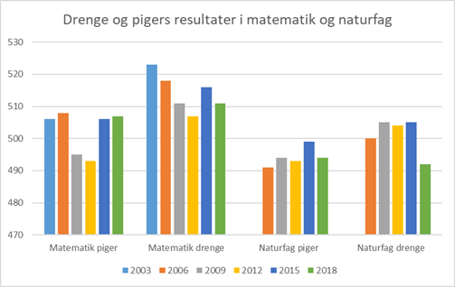 I både matematik og naturfag dækker udviklingen over, at piger har resultater på cirka samme niveau i 2018 som i de første PISA-runder, mens drenges gennemsnitlige resultat er blevet dårligere. I matematik har drengenes resultater dog været stabile siden 2009. I naturfag er drengene gået tilbage siden 2015, efter at have haft stabile resultater i en årrække.