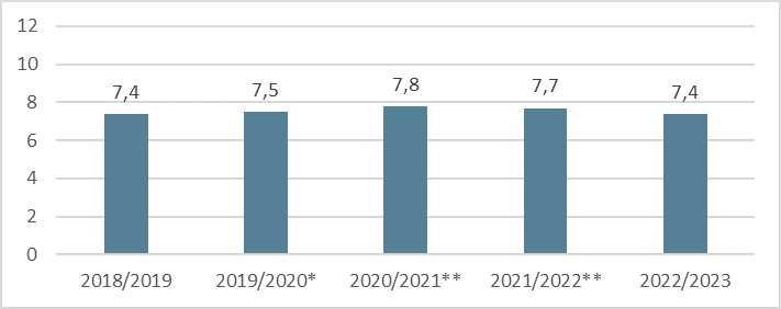 | Gennemsnit i obligatoriske prøver i 8. klasse | 2018/2019 | 2019/2020 | 2020/2021 | 2021/2022 | 2022/2023 |