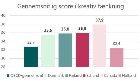 Danske elever scorer i gennemsnit 35,5 point i kreativ tænkning på en pointskala fra 0-60. Dermed scorer danske elever over OECD-gennemsnittet og på niveau med Finland og Estland. Sådan lyder en af konklusionerne i en ny rapport udarbejdet af Det Nationale Forsknings- og Analysecenter for Velfærd (VIVE) for Børne- og Undervisningsministeriet. Norge og Sverige deltog ikke i undersøgelsen.